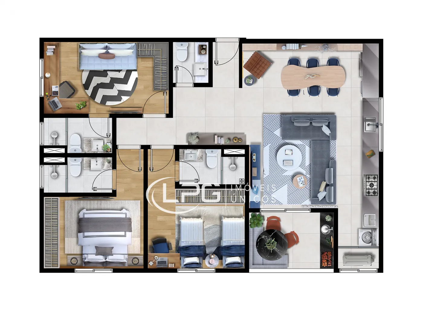 Com 107m² de área privativa, este apartamento se destaca pela planta funcional e pela distribuição equilibrada dos ambientes, oferecendo um espaço confortável e criando um ambiente agradável.